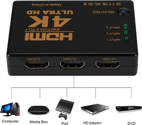 - 3 bemenet / 1 kimenet – ideális kevés HDMI porttal rendelkező TV-khez.