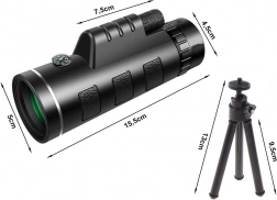 - A csomag tartalma: 40×60-as monokuláris távcső, állvány, telefontartó, tok, objektívsapka, zsinór karabinerrel, tisztítókendő, eredeti csomagolás.