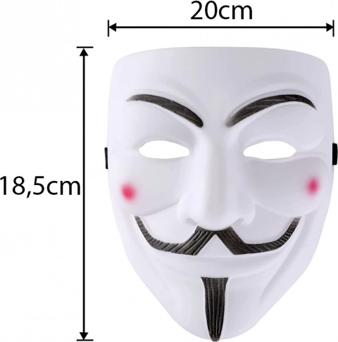 Fedezze fel az anonimitás és lázadás szimbólumát a Guy Fawkes maszkkal, amely a V mint Vérbosszú filmből ismert és az ANONYMOUS mozgalomhoz kötődik. A hű részletek – hangsúlyos szemöldök, bajusz és kecskeszakáll – jól érvényesülnek a fehér alapon, finom rózsaszínes pírral az orcákon. A maszk könnyű műanyagból készült, és az elasztikus pántnak köszönhetően kényelmesen viselhető.