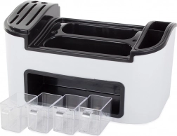 A rendező alsó részén négy tágas, esztétikus átlátszó műanyag fiók található, ideális kávé, tea vagy cukor tárolására. A rendező minden eleme könnyen levehető az alapos tisztításhoz, az alap pedig csepegtetőként működik a szárazság biztosítására.