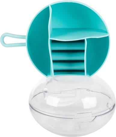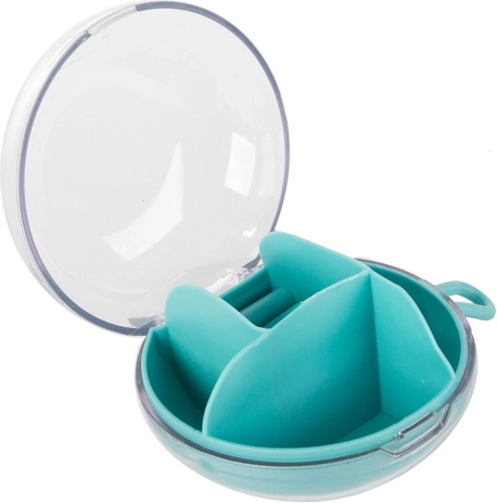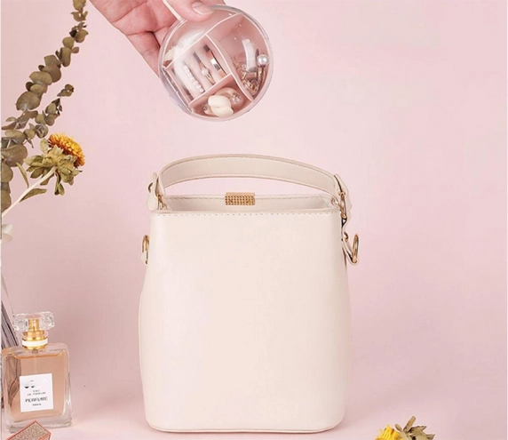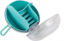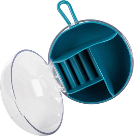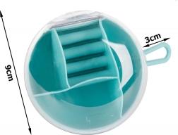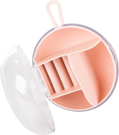 A kivehető középső rendezőnek köszönhetően a rekeszek egy része önállóan is használható. A kompakt méret, átmérő 9 cm és magasság 6 cm, ideálissá teszi kézitáskába, bőröndbe vagy a pipereasztalra. Elérhető színek: rózsaszín, sötétkék, zöld.