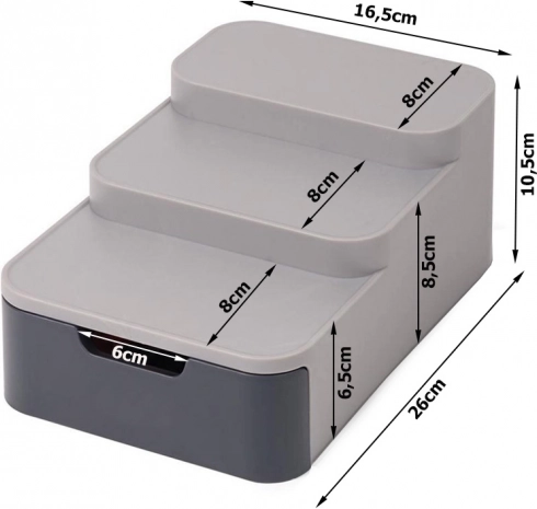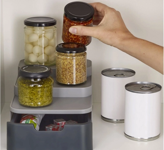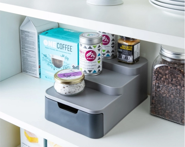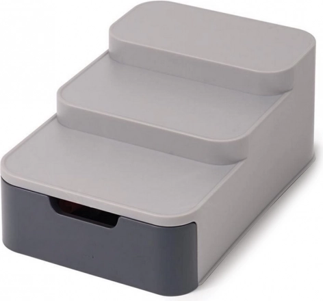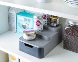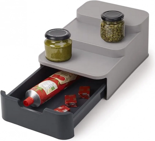 Ez a kompakt rendező hatékonyan kihasználja a helyet a kamrában vagy a szekrényben. A három szint jobb rálátást biztosít a hátul lévő üvegekre és dobozokra, míg a kihúzható fiók elnyeli a tasakokat, tubusokat és egyéb apróságokat. A tartós szürke műanyag könnyen tisztítható, és remekül illik a modern konyhákba.