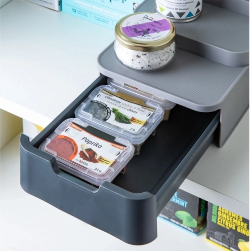 Az integrált fiók elfér benne tasak, tubus, fűszertöltet vagy apró kozmetikumok, és mindent rendezett módon egy helyen tart.