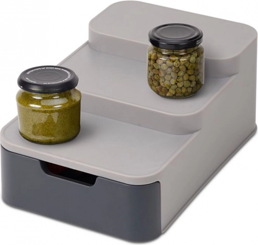 A lépcsőzetes elrendezésnek köszönhetően könnyen láthatóak és elérhetőek a hátul lévő üvegek és dobozok is. Ideális fűszerekhez és konzervdobozokhoz.