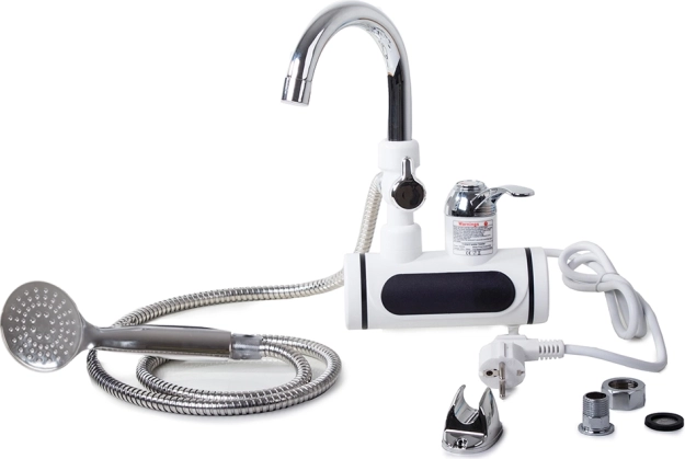 - A készlet tartalmaz: vízmelegítőt, 140 cm hosszú zuhanycsövet, zuhanyfejet, fali rögzítőt, és csatlakozó elemeket