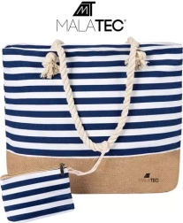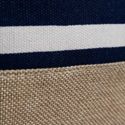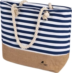 Kék–fehér csíkok és juta hatású alsó rész teremtenek friss, nyári megjelenést. Erős kötélfogantyúk biztosítják a kényelmes hordást még teljesen megtöltve is.