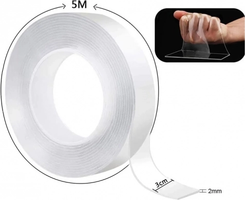 A kétoldalas átlátszó szalag nagyon könnyen alkalmazható. Elég finoman megtisztítani a felületet, amelyre alkalmazni akarjuk, és rányomni a szalagot. Könnyen eltávolítható és újra használható mosás után, anélkül, hogy maradványokat hagyna. Használja képek függesztésére, különböző konyhai eszközökre, kábelek, léc vagy szőnyegek rögzítésére.