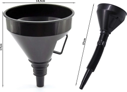 A nagy műanyag tölcsér finom szűrővel ideális segítő a pontos folyadékok öntéséhez a műhelyben és otthon. Kemikáliák ellenállása és rugalmas csúcs biztosítja a könnyű használatot kiömlés nélkül.