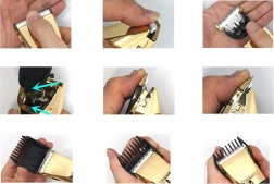 - Készülék, 4 vezetőfésű (3/6/9/12 mm), tisztítókefe, kenőolaj, hálózati töltő
