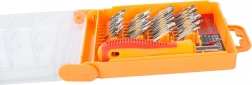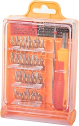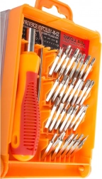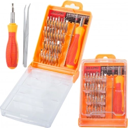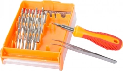 A készlet 30 mágneses bitfejet (PH, lapos, torx, imbusz, Y, háromszög), egy markolatot és egy csipeszt tartalmaz. Minden, ami szükséges elektronikához, apró otthoni javításokhoz és hobbi felhasználáshoz.