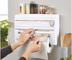 Két fóliatartó, egy papírtörlő-tartó és egy felső polc a fűszereknek vagy apróságoknak: mindent egy helyen tart, és helyet szabadít fel a munkalapon.