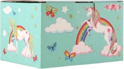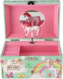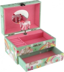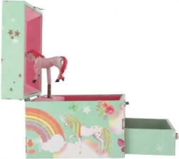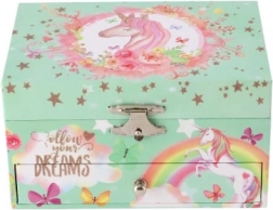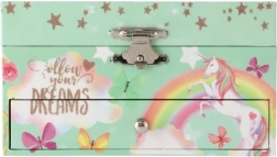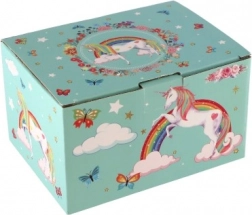 Varázslatos, pasztellzöld egyszarvú mintás zenélő ékszerdoboz, amely minden kis díszítkedőt elbűvöl. A felhúzókulcs megtekerése után belül az egyszarvú figura forogni kezd, és finom melódia csendül fel. Belül tükör, áttekinthető rekeszek és egy praktikus fiók várja az apró kincseket. Tartós kartonszerkezet, fém elemek és bájos szivárvány-, csillag- és pillangóillusztrációk díszítik a gyerekszobát.