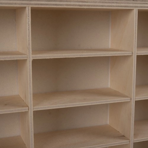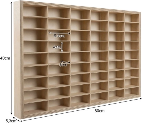 Az okos, kivehető elválasztó rendszer 3 mm-es rétegelt lemezből lehetővé teszi az elrendezés igény szerinti módosítását – alakítson ki kisebb vagy nagyobb rekeszeket pontosan a gyűjteményéhez. A polc elő van készítve falra szerelésre, de komódra vagy asztalra is állítható. A csomagban szerelőkészletet és 2 akasztót talál a biztonságos rögzítéshez.