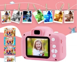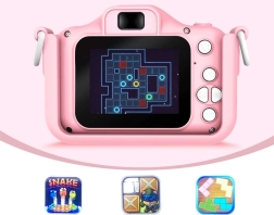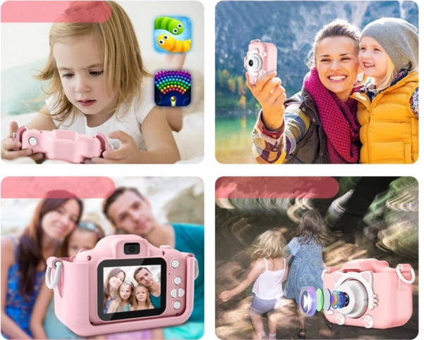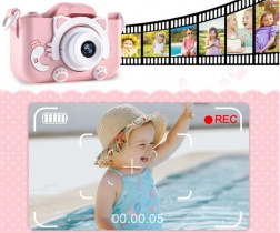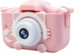 A fényképezőgép rózsaszín, cicás kialakítással, fülekkel és tappancsokkal azonnal elnyeri a gyerekek tetszését.